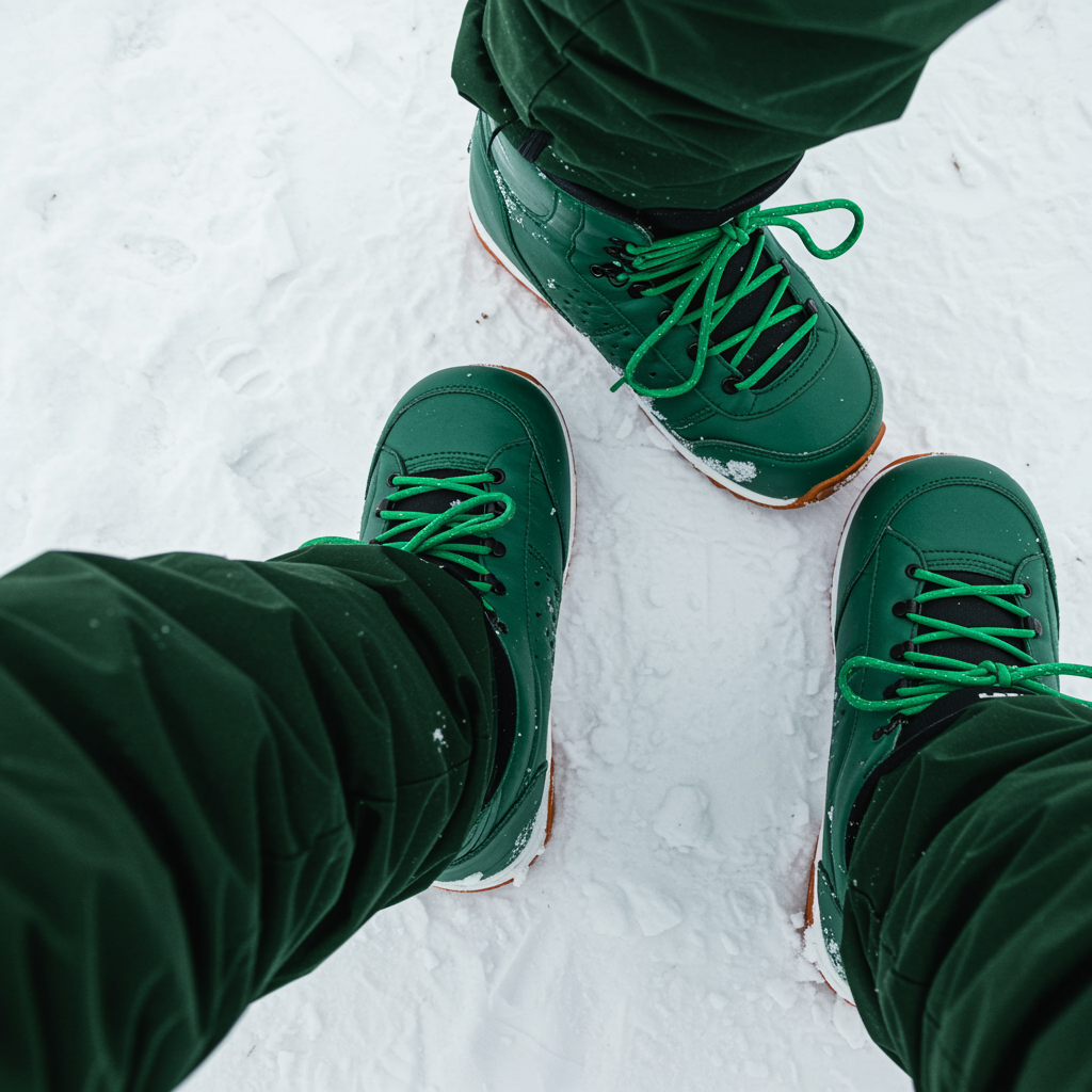 Gazing down at my feet, I noticed the vibrant emerald leather snowboard boots, laced up with matching green strings. The snow pants, a dynamic blend of black and forest green, seemed to ripple like wind through trees as they brushed against the crisp, glistening snow.