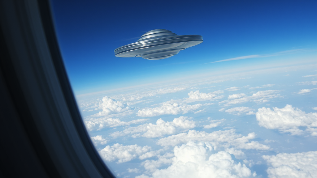 Gazing out from the window of a passenger plane, fluffy white clouds stretch across the horizon, while a mysterious UFO hovers amid the vast blue sky, its metallic sheen catching the sunlight, hinting at secrets beyond the clouds.