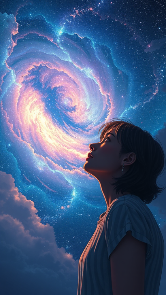 Gazing thoughtfully at the infinite sky, immersed in wondrous contemplation, the heavens display a swirling magical glow. Centered and highly detailed, this visual narrative captures breathtaking beauty with precise linework, vibrant hues, and a comprehensive cinematic feel. Inspired by Kelly McKernan's style, the artwork boasts 8k resolution, HDR quality, and high-resolution digital art finesse. The scene remains harmonious, avoiding errors such as text misplacements, missing or extra digits, and any distorted anatomy. The focus is on capturing the ethereal beauty of the scene without distractions like watermarks or unintended visual flaws.