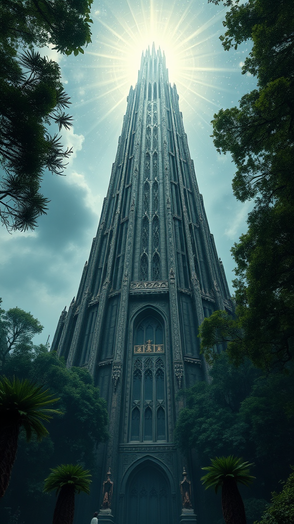 Gazing up at an ancient, infinitely tall cosmic Tower of Existence, radiant and imposing, reaching the skies, reminiscent of Dark Souls and World of Warcraft's dark fantasy worlds, with architecture inspired by Antoni Gaudí. The environment is detailed and atmospheric, blending the macabre with lush greenery. Misty and intricately designed in a style reminiscent of Joseph Mallord William Turner and Alan Lee's Tolkien illustrations, it’s symmetrical and incredibly realistic. The setting is captured from a bird's-eye view in an ultra-wide, epic shot, offering an HD spectacle of cosmic grandeur and intricate detail.