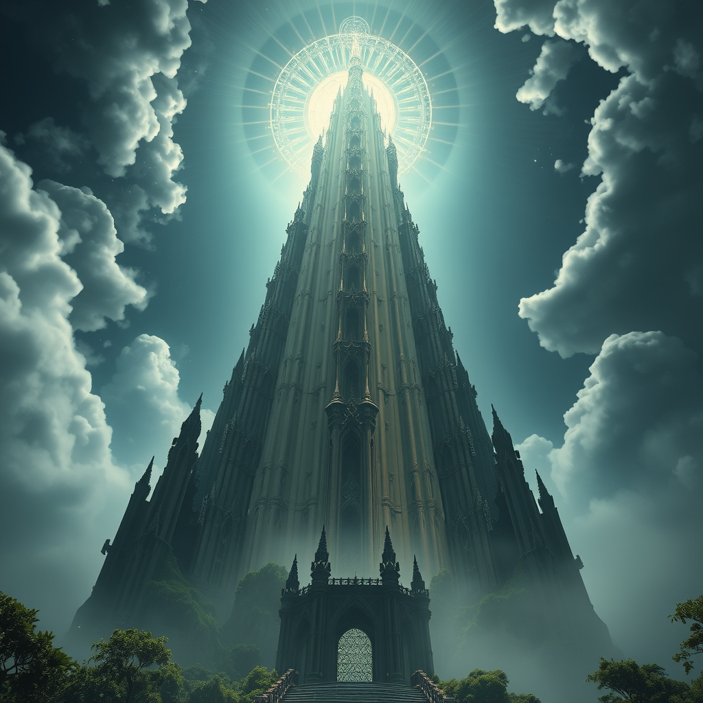 Gazing upon an ancient, infinitely tall cosmical Tower of Life and Death, bathed in radiant light with an ethereal halo, this imposing structure soars into the skies. It evokes a world akin to Dark Souls, with an Elhihoe style reminiscent of World of Warcraft, entwined with dark fantasy themes. The architecture channels the essence of Antoni Gaudí, creating a detailed environment reminiscent of Joseph Mallord William Turner’s artistic style, blended with the intricate nuances of Alan Lee's Tolkien illustrations. Symmetrically designed, surrounded by lush greenery, the tower is both intricate and dark, with a macabre yet atmospheric presence. Shrouded in mist and illuminated by radiant light, the scene is incredibly detailed and extremely realistic. Viewed from a bird's-eye perspective, this ultra-wide, epic shot captures the grandeur in stunning HD.