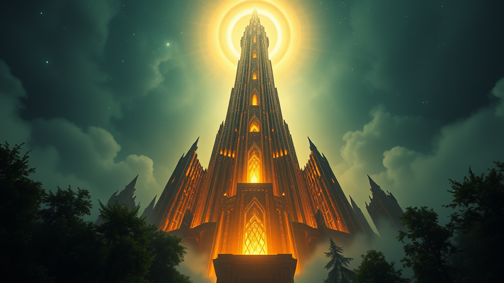 Gazing upon an ancient, infinitely towering cosmical structure known as the TOWER OF LIFE AND DEATH, it radiates a luminous glow with a celestial halo. This imposing spire ascends to the heavens in a world reminiscent of Dark Souls, blending elhihoe aesthetics with the epic scope of World of Warcraft's dark fantasy. The tower's architecture echoes the intricate, organic genius of Antoni Gaudi, set in an environment brimming with the atmospheric detail of Joseph Mallord William Turner and the fantastical vision of Alan Lee's Tolkien. Symmetrical and surrounded by lush greenery, it stands as a complex and dark edifice, both macabre and atmospheric. The scene is shrouded in mist, bathed in radiant light, and depicted with incredible detail and realism from a bird's eye perspective, captured in an ultra-wide epic shot that is HD --ar 16:9 --v 3 --s 2000.