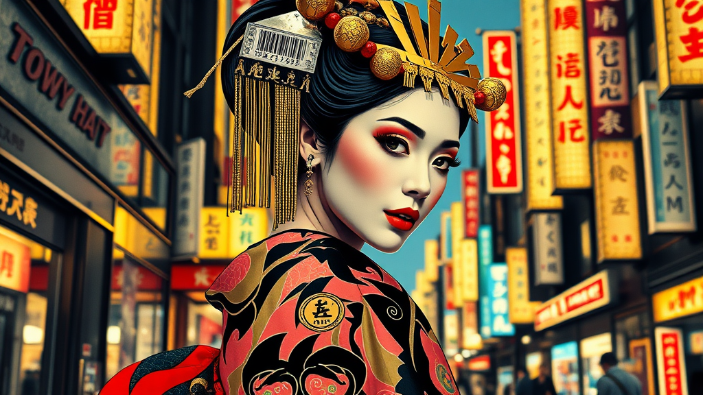 Geisha in op art style with a hyper-arabic Egyptian girl in dynamic posture, female model navigating the vibrant streets of Tokyo. A collage featuring brutalism, gold blocks, and Arabic calligraphy graffiti reminiscent of a Christian Hilfgott Brand portrait. Inspired by pop surrealism and reimagined by Industrial Light and Magic. Infused with the intricate detailing of DC Comics, this artwork captures a metallic fusion of gold and silver elements. Behance HD aesthetic, behance contest winner.
