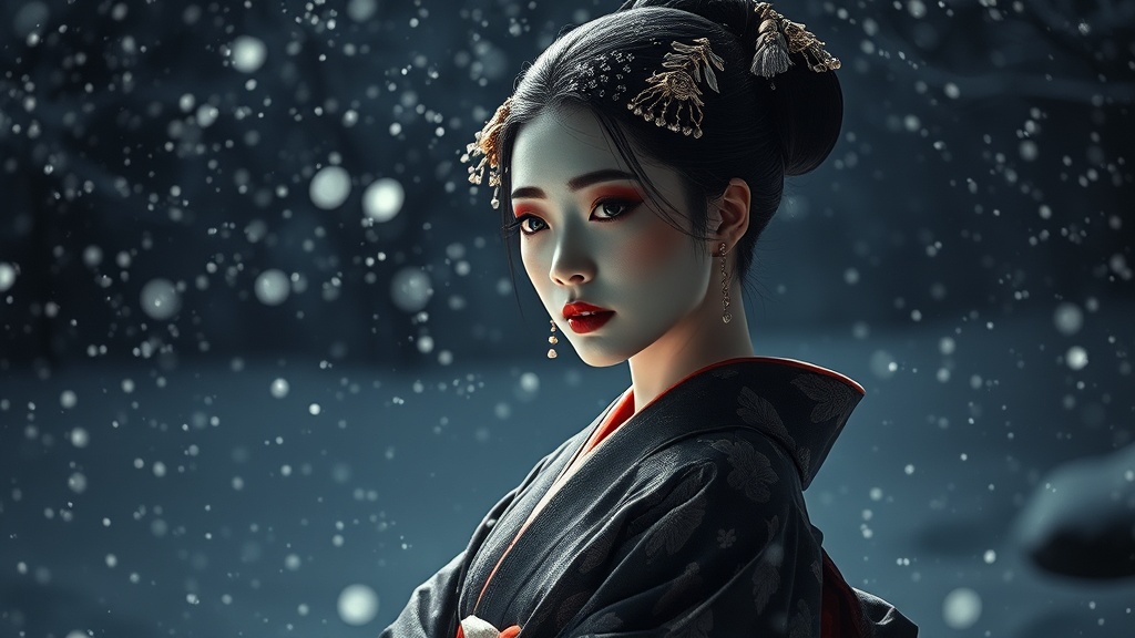 A mesmerizing Geisha standing gracefully in a snow-covered landscape, her milky white skin glistening under soft, dramatic lighting. Her kimono is a masterpiece of intricate design, with ultra-detailed patterns reminiscent of Tom Bagshaw’s and Seb McKinnon’s artistry. The scene exudes a cinematic quality with volumetric lighting enveloping her, captured in the photorealistic style of a Hasselblad H3DII. Her expression is serene, embodying an ethereal beauty, with the snowflakes creating a delicate contrast against the dark, elegant shades of her attire. The 150mm octane render ensures every detail from her ornate hairpins to the subtle textures of the falling snow is vividly accentuated, resulting in a hyper-realistic portrayal of tranquility and sophistication.