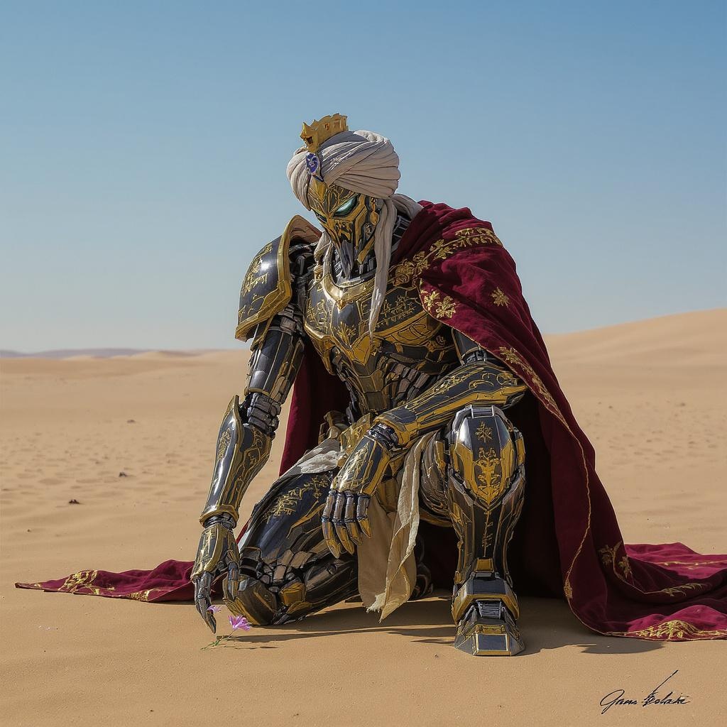 A majestic 1800s Sikh king, clad in a turban and an intricately designed Japanese mecha exoskeleton Gundam suit, reminiscent of a Warhammer fusion; the suit is adorned with a long, flowing heavy cape. The carbon fibre exoskeleton is engraved with shimmering gold Punjabi script, imbuing it with mystical powers. The art style echoes the intricate detail of Billelis, with the king’s face obscured by a finely crafted metal mask. Positioned centrally, he kneels in the vast, serene expanse of a barren desert, gently picking up a solitary flower. The armor, a masterpiece of neo-futuristic technology, exudes an otherworldly allure. This scene captures a harmony between the rich tapestry of modern history and futuristic innovation. The endless desert backdrop stretches out beneath the clear blue sky in natural daylight, studded with blink-and-you-miss details. The piece draws inspiration from Akira and Star Wars, with meticulous attention to detail resembling the works of Akira Kurosawa, Norman Rockwell, Syd Mead, Boris Vallejo, Jean Giraud Moebius, John Berkey, Eugène Delacroix, and Rembrandt Van Rijn, inviting viewers to a moment of tranquility and nostalgia, fused with avant-garde elements.