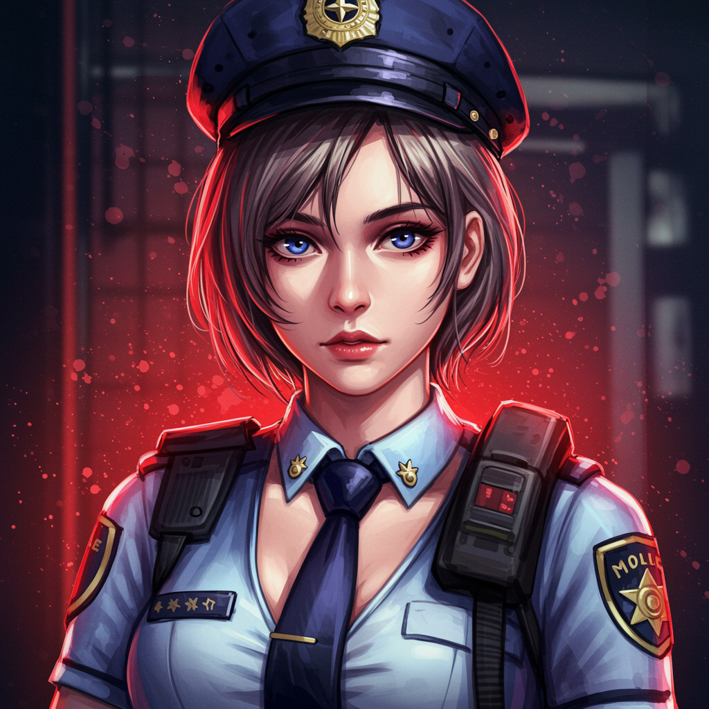 View this AI-generated image featuring 1girl resembling jill valentine from resident evil 3 dressed in a detailed police uniform stunningly intricate and colorful hair anime style portrait of a young woman featuring strong shadows and vibrant rim lighting executed in a watercolor style with traditio