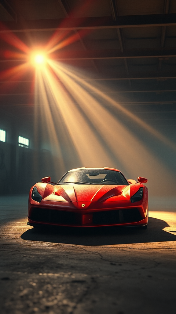 90's found footage VHS style, film grain, cinematic feel, realistic depiction, red Ferrari parked in an expansive garage, enhanced by volumetric lighting that highlights the dusty and cluttered environment, soft and hazy light creates an ultra-realistic atmosphere, radiant light rays filter through, enhancing high-resolution detail in a 3D rendered scene, reminiscent of artstation matte paintings and highly detailed concept art. Emphasize an exaggerated light aesthetic, akin to a magazine cover, with backlit magical lighting beams illuminating dust particles, adding warmth and color depth. The scene features a cropped layout, suggesting a slightly out-of-frame toy car with a 2D cartoon and anime-inspired style.