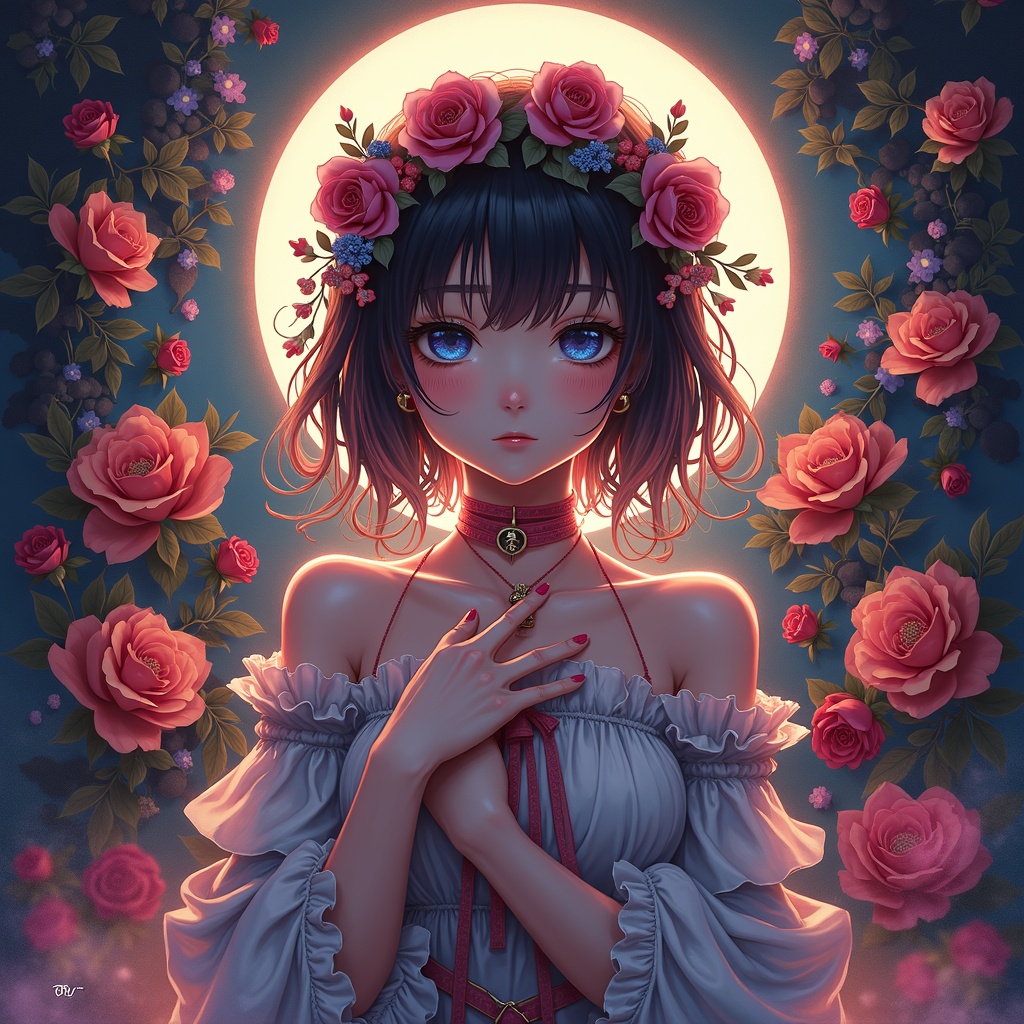 View this AI-generated image featuring a vibrant acrylic artwork featuring a beautiful anime inspired girl illuminated by holy cinematic rim lighting adorned with intricate floral decorations the scene is rendered in a rococo art style with elements of chiaroscuro and 3d cgi creating a mesmerizing b