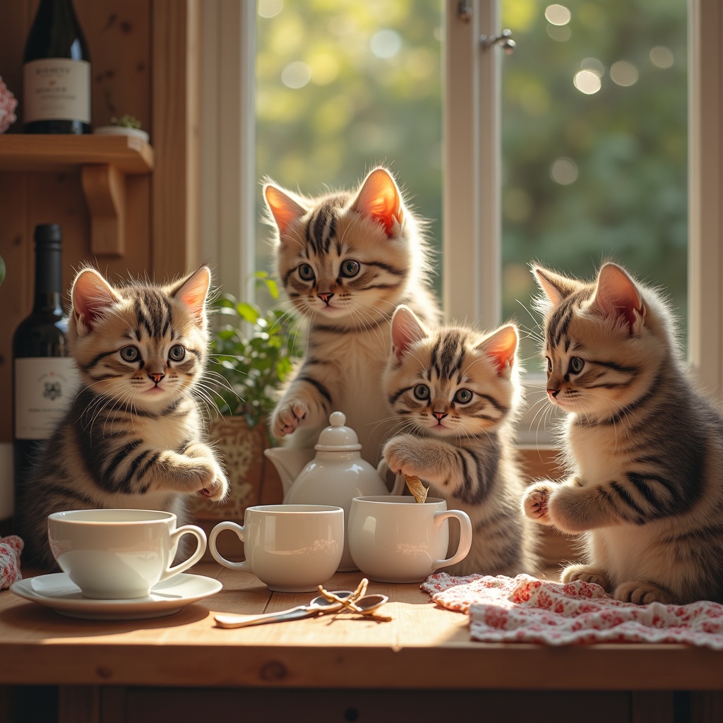 Adorable kittens bustling around a cozy cottage, expertly preparing tea, brewing aromatic coffee, and crafting rich hot chocolate. These furry little gourmets delight in fetching delicious meals from the pantry and selecting fine bottles of wine from the cellar, all while adding their own playful, whisker-twitching charm to the culinary dance.