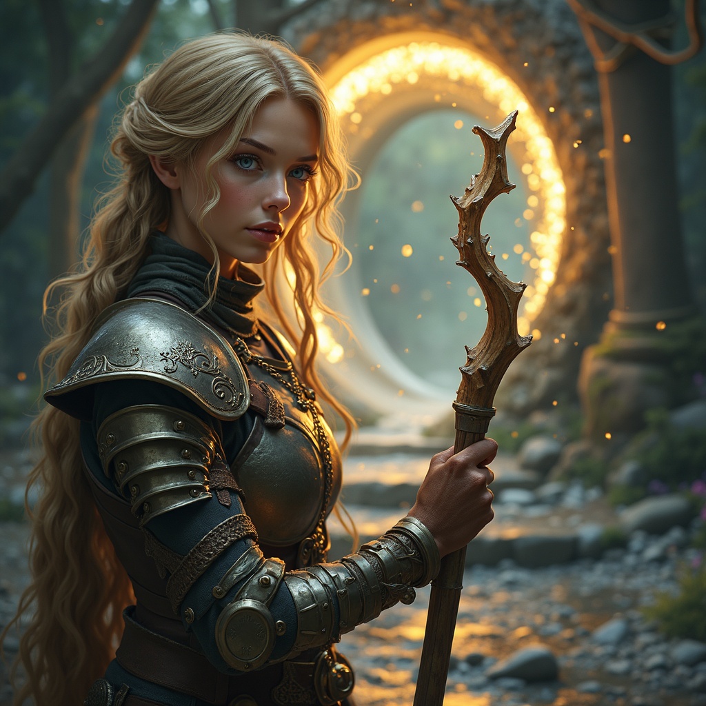 View this AI-generated image featuring a fantasy adventurer clad in intricate armor and wielding a mystical staff stands with determination before a swirling portal that leads to a world more serene and vibrant the portal shimmers with ethereal light casting a warm inviting glow on the adventurer s