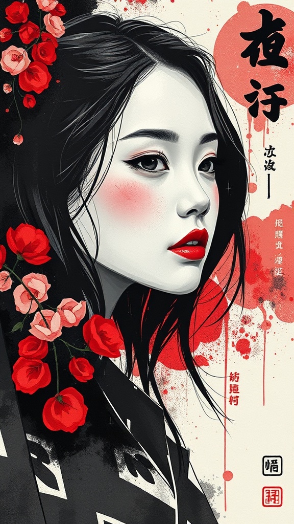 Aesthetic fusion of two-tone black and white with simplified shapes featuring a figurative, gorgeous young Asian girl; a rich blend of acrylic and watercolor textures in the style of oil painting and photography, enhanced by digital art precision. Emphasizing bold brush strokes, the scene is punctuated by pops of dark red amidst high detail and intricate design. Infuse elements of low-poly abstraction and surrealism, with Kanji and Katakana characters woven into the composition. Niji style meets graffiti with comic and anime influences, crafting a visually striking and deeply expressive artwork.