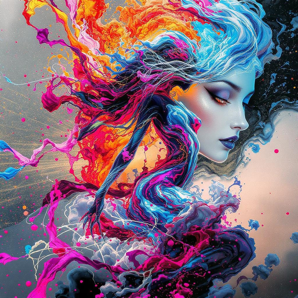 View this AI-generated image featuring alberto seveso inspired artwork featuring a dynamic silhouette of a mesmerizing woman swathed in swirling water ink and vivid ink clouds 3d digital painting with intricate detail enhanced by god rays and curvy cinematic lighting rendered in octane for a stunnin