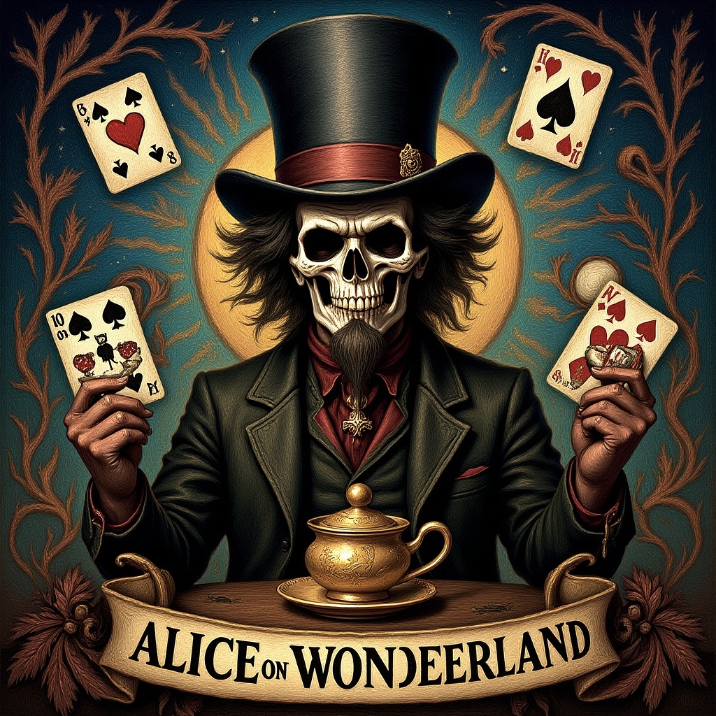 View this AI-generated image featuring alice in wonderland inspired scene featuring the mad hatter as a magician in a tarot card featuring intricate details the character has a half skull face and a cinematic presence the image is rendered in 8k resolution blending styles reminiscent of stanley artg