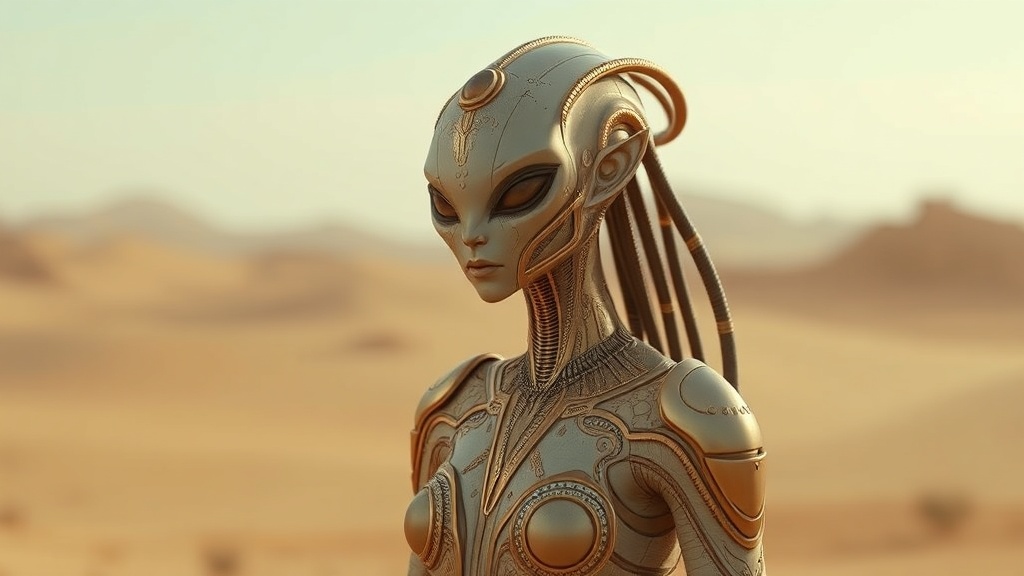alien entity in desert landscape, futuristic elegance, muted beige and shimmering gold tones, blurred background, solarpunk aesthetic, fantastical postures, vast skies, mesmerizing, version 5.2