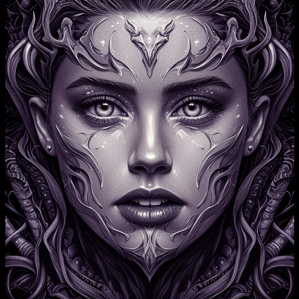 Amber Heard, intricately detailed face, mesmerizing ultra-detailed eyes, alluring expression, luminous, radiant skin, impeccably defined eyes, glowing, unsettling teeth, skeletal, malice, skull motifs, tendrils weaving through a dark ambiance, grayscale, finely detailed linework, cinematic quality, psychedelic elements, bold amethyst lines on black paper, ornate and symmetrical, tarot card aesthetic, highly detailed ink illustration, inspired by Peter Mohrbacher's style, golden ratio principles, model: Lyriel v1.5, 3D aesthetic with elements of cartoon and anime, subtle creative modifications maintaining the essence of the original concept.