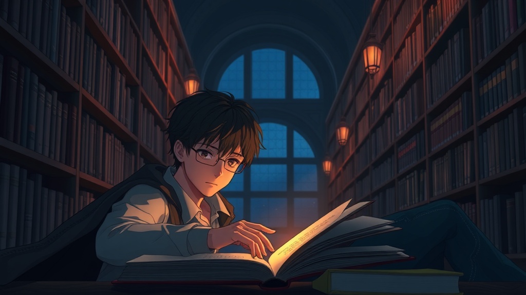 Anime-inspired introverted boy nestled in the dim glow of an academic library during twilight, immersed in the pages of a book, embodying the mystique of dark academia with a reflective INFJ aura.