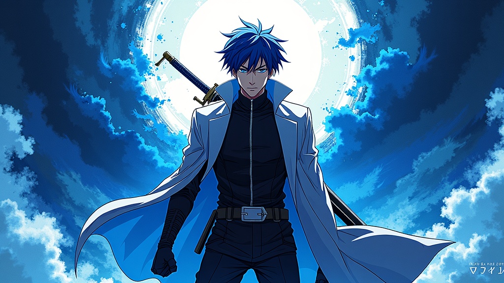 A dynamic anime poster featuring a male protagonist dressed in a sleek black, white, and blue ensemble, reminiscent of Yoh Nagao's artistic style. The character is poised with an intense and confident expression, holding a sword that glistens under a radiant light. The background is a mesmerizing display of light-focused ink splashes, creating an ethereal atmosphere that radiates energy and intensity. Vibrant blues interweave with stark whites and deep blacks, forming an abstract pattern that amplifies the character's enigmatic presence and captures the viewer's imagination.