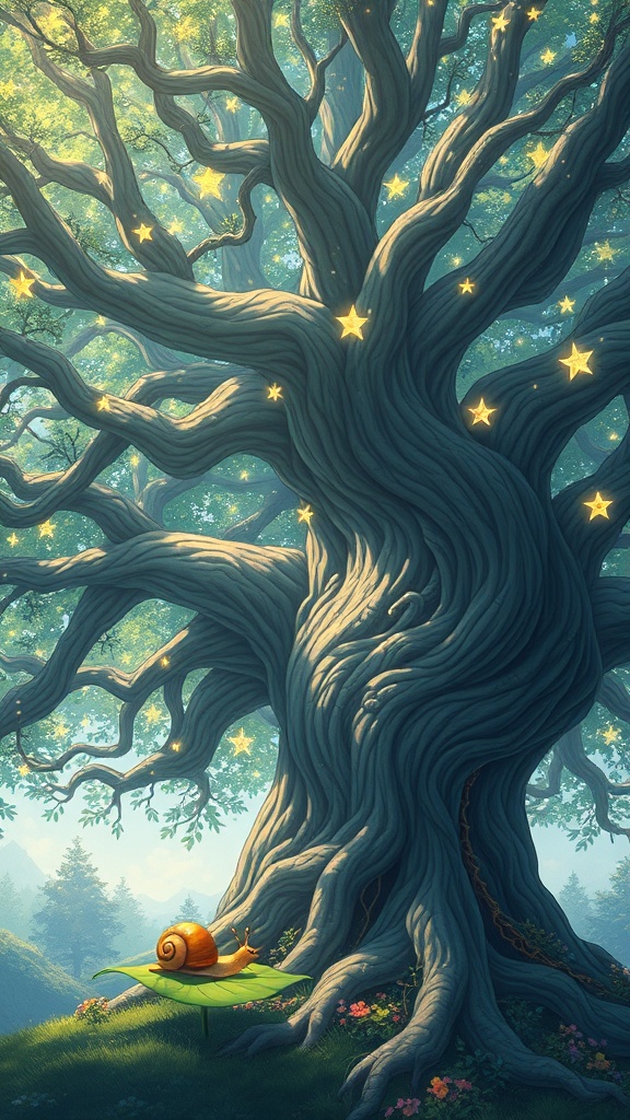 An enchanting anime-style scene featuring a colossal, ancient tree at its heart, its branches like delicate tendrils adorned with countless twinkling stars, casting a celestial glow over the landscape. The tree stands in a luminous landscape, where art nouveau motifs intertwine with pristine naturalism, creating a harmonious fusion of nature and fantasy. Intricately detailed, the bark of the tree resembles a labyrinthine tapestry of twisting vines and floral patterns. A tiny snail rests on a leaf, embodying the whimsical spirit of snailcore, as ethereal light filters through the canopy. In this enchanted forest, d&d fantasy elements emerge with mythical creatures subtly hidden amongst the roots and foliage. A sense of tranquility envelops the scene, as soft, radiant light fills the air, highlighting the vivid colors and intricate details that bring the magical world to life.