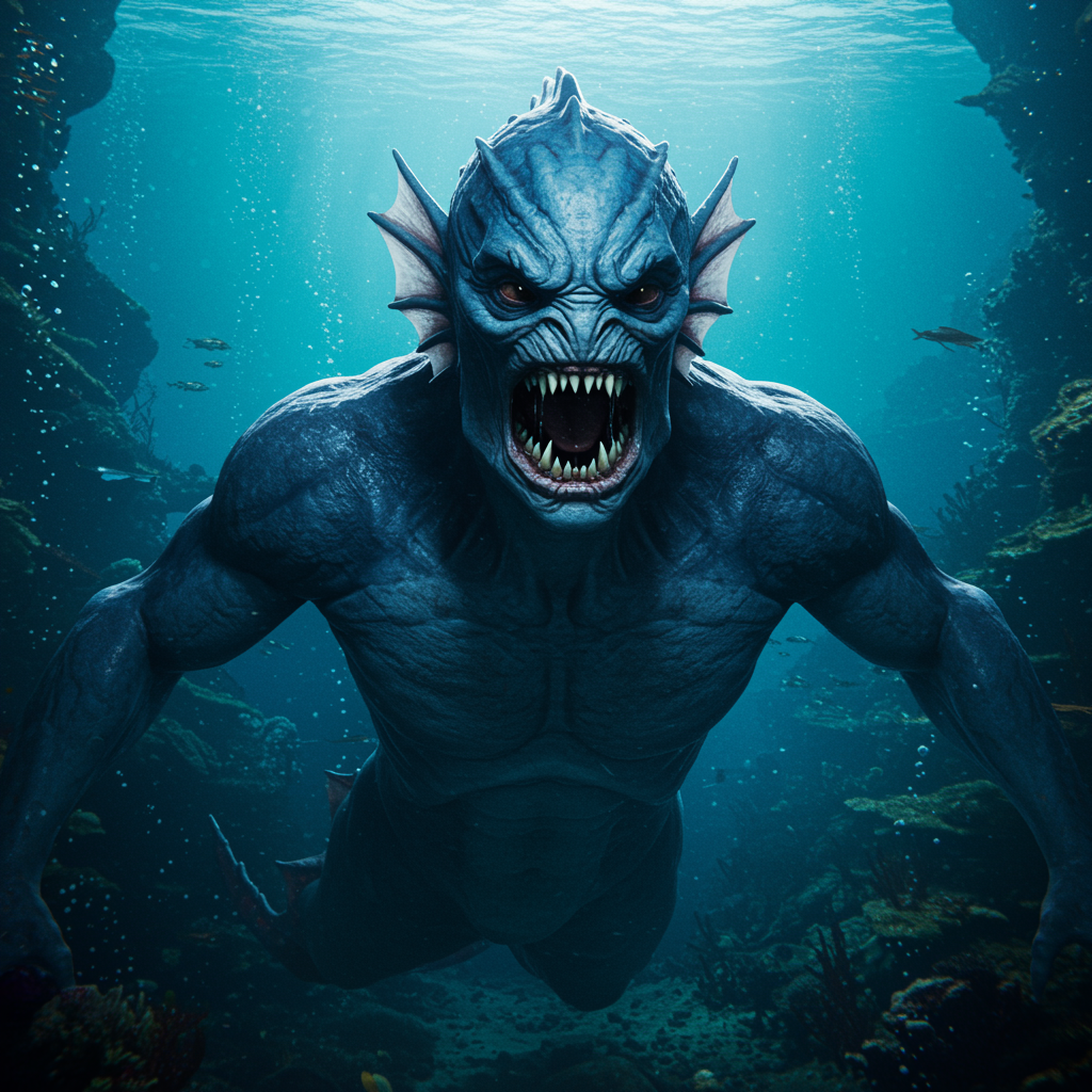 View this AI-generated image featuring a formidable aquatic entity with humanoid characteristics and angular contours displaying a striking blue skin tone its visage is marked by a furrowed brow and a mouth agape with razor sharp teeth the creature exists in a subaqueous realm enveloped by an underw