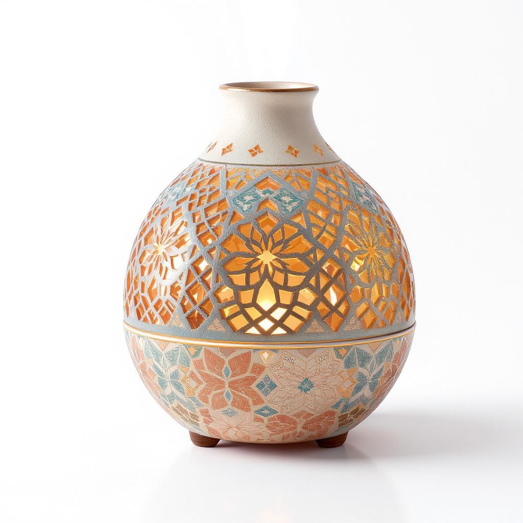 View this AI-generated image featuring aromatherapy diffuser drawing inspiration from the vibrant geometric motifs of islamic art and architecture featuring a ceramic exterior adorned with delicate symmetrically intricate cutouts that let warm light glow through the detailed patterns rendered in the