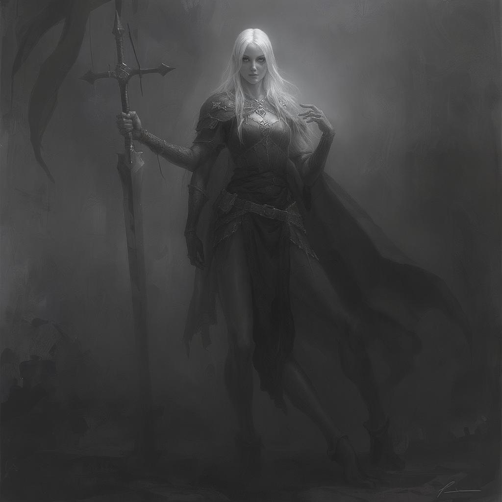 Art inspired by Greg Rutkowski, digital illustration, featuring a character in a proud pose. Capturing a gray, dark fantasy atmosphere with medieval elements. The composition focuses on symmetry and ultra-high quality, emphasizing detail and ambiance. Despite the potential for technical imperfections such as artifacts, watermarks, and text errors, the central figure stands prominently within the frame. They may exhibit intriguing anatomical anomalies, adding to the mystique of the scene, like unusual numbers of limbs or fingers, enhancing the fantasy aspect. The overall mood is mysterious, with slight distortions and blurring that suggest an ethereal presence.