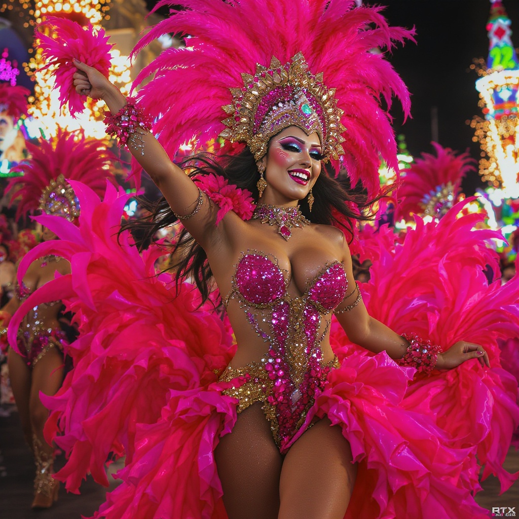 Artistic photography of a stunning woman in vibrant pink and shimmering gold costume dancing energetically at the Rio Carnival, captured in the style of RTX On. The scene explodes with colorful mosaics and a chrome-plated finish, exuding joy and optimism. Her hourglass figure is accentuated, with bold, flowing lines defining her silhouette. Rendered with the intricacies of Unreal Engine, the image is hyperrealistic and ultra-detailed, featuring plastic textures and delicate embroidery. The atmosphere is lively and celebratory, embodying the spirit of festivity.