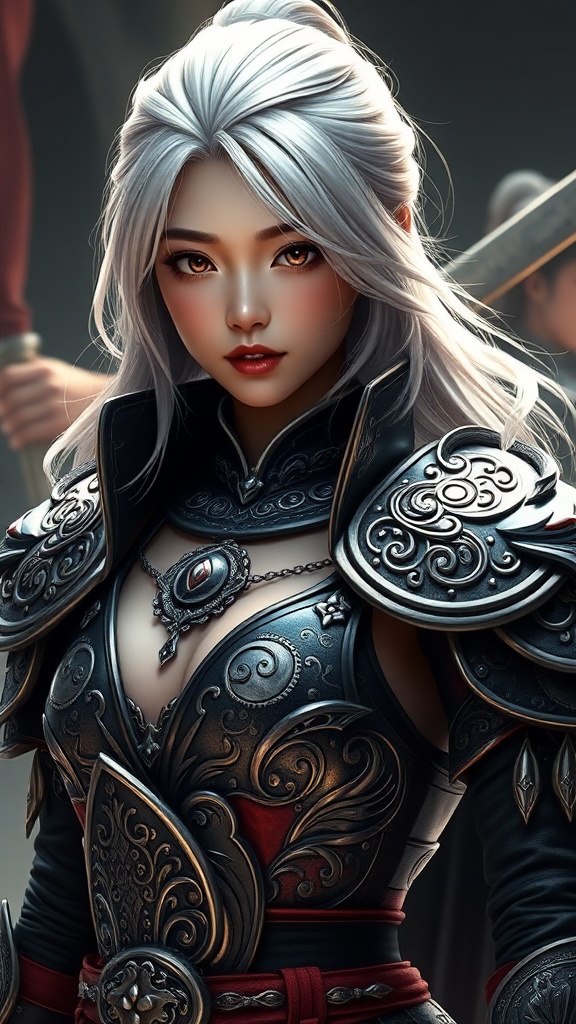 View this AI-generated image featuring asian girl warrior poster strikingly detailed and elegant featuring a beautiful young asian girl with an intricately gorgeous face her full body depiction showcases olive skin and medium length platinum hair wearing exquisite revealing armor with complex design