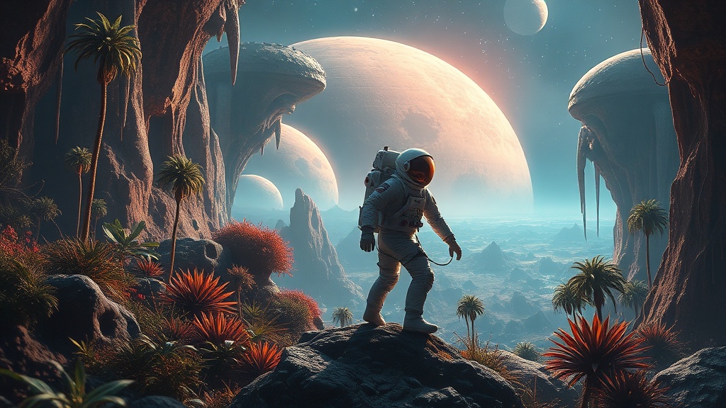 Astronaut exploring a lush alien landscape, a breathtaking sci-fi masterpiece featuring an atmospheric scene with exquisite detailing and vibrant colors, captured in stunning 4k resolution, showcasing intricate patterns and textures, with the essence of adventure and discovery trending on platforms like ArtStation, enhanced by nartfixer and nfixer artistic elements.