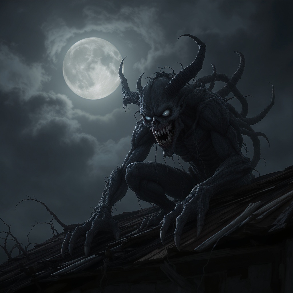 View this AI-generated image featuring a terrifying aswang with glistening fangs crouches menacingly on the roof of an old weathered house under a luminous full moon the atmosphere is steeped in darkness and macabre horror capturing the essence of philippine folklore the scene is rendered in hyperre