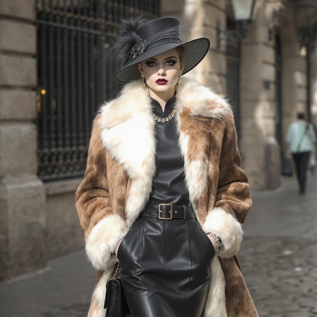 View this AI-generated image featuring autumn 2017 paris fashion with an irving penn twist a blend of ivory elegance poodlepunk flair and timeless styles from 1860 1969 featuring luxurious leather hide textures infused with richard doyle s whimsical charm embodying the spirit of ready made fashion.