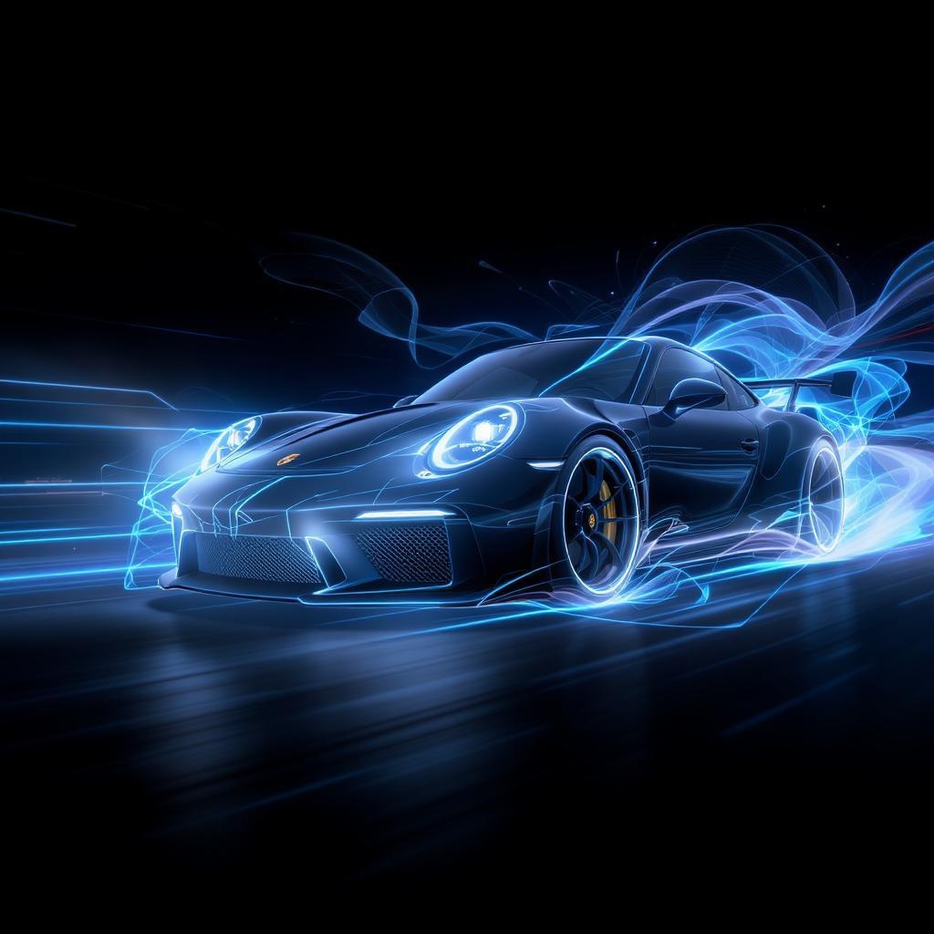 Backlight Porsche 911 in a sleek and modern 3D abstract digital artwork featuring bold black, white, and blue tones. The design incorporates fluid and sharp lines with a sense of dynamic movement. It is optimized for depth of field with intricate shaders, utilizing RTX and CGI technology to create a visually stunning composition. Volumetric light enhances the scene, rendered with octane for exquisite detail, perfect as a high-resolution wallpaper. The atmosphere is vibrant and energetic, with an artistic sense of controlled chaos and subtle surrealism, maintaining an aspect ratio of 16:9.