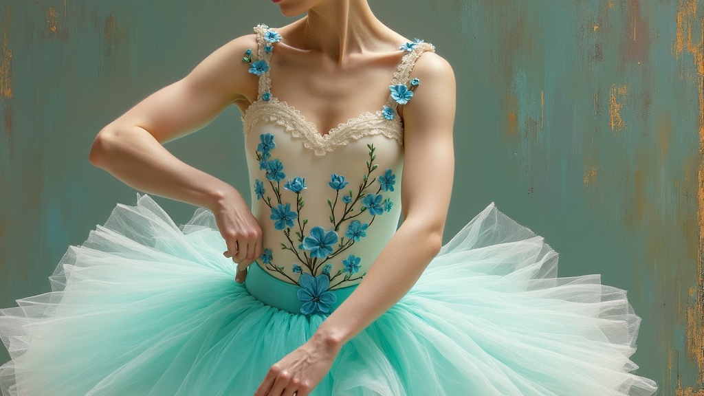 View this AI-generated image featuring a painting of an elegant ballerina adorned in a delicate ivory bodice embroidered with azure blossoms and a sea green tulle skirt inspired by the renowned painter edgar degas the artwork showcases degas distinctive style with its brilliant use of vibrant hues d