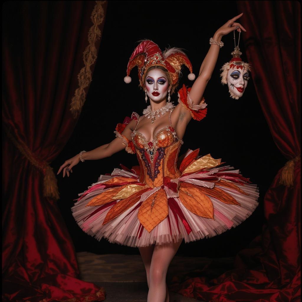 Ballerina, elegant woman, striking charm, harlequin essence, intricate hand puppet, Venetian carnival spirit, rich Kodak Portra 800 tones, hyper-photographic realism, ultra-detailed textures, --ar 9:16