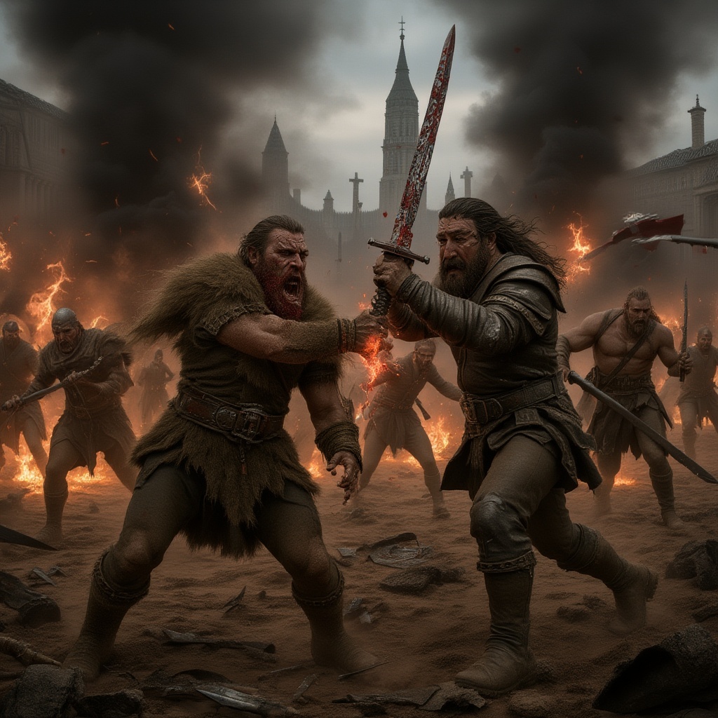 In the midst of a fierce battle, Ragnar Lothbrok, smeared with earth and smeared with the crimson of battle, brandishes a nicked Viking sword, meeting the clash of his brother Rollo's Frankish broadsword. Their weapons lock with a burst of fiery sparks, each trying to overpower the other. Surrounding them, the battlefield is a tumult of chaos: Viking warriors, clad in fur and ringed armor, wage war against Frankish soldiers. The air resonates with the shattering of shields by axes and the piercing cries as spears find their mark. In the background, a mighty long-haired berserker cuts a swath through foes, while a mortally wounded soldier painstakingly crawls toward a toppled banner. The earth beneath them is strewn with broken blades, scattered arrows, and Rollo's baptismal cross, now embedded in the mud. Smoke rises from burning dwellings, clouding the view of the once-majestic Parisian skyline, with the solemn silhouette of a stone church tower standing watchful in the distance.