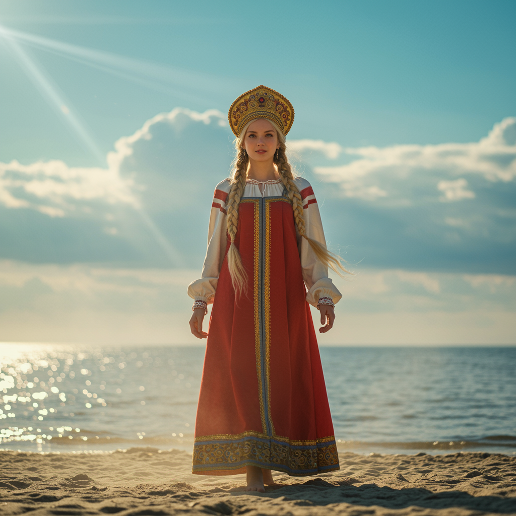 Beautiful Russian princess with a golden crown and traditional Russian dress, walking along a beach under a clear blue sky with clouds and a shimmering body of water. She has long braided blonde hair flowing in the breeze, and her captivating gaze and alluring expression draw you in. The composition is reminiscent of a cinematic film still from the 1980s, captured with the aesthetics of Kodak Portra 800. Her facial features, eyes, and attire are rendered with extreme detail, showcasing ultra-realistic textures. A symmetric background highlights the scene, enhanced by radiant light rays and a soft, misty ambiance. Backlit illumination creates a magical atmosphere, with dust shimmering in the light beams. The scene has an analog style with modern digital finesse, resembling concept art on ArtStation. The pinup's realistic shadows and natural skin texture are achieved through a combination of octane render, unreal engine 5, and post-processing techniques like ambient occlusion and tone mapping. This highly detailed, ultra-realistic portrayal has an exciting, happy, and moody aesthetic, with a touch of heavenly, shadowy realism.
