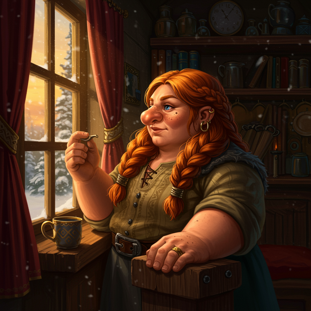 View this AI-generated image featuring a cozy beautifully detailed illustration of a charming hearty chubby dwarven woman standing at her warm inviting home gazing thoughtfully out the window on a snowy day her face is highly detailed with a captivating complexity her redhead hair is intricately bra