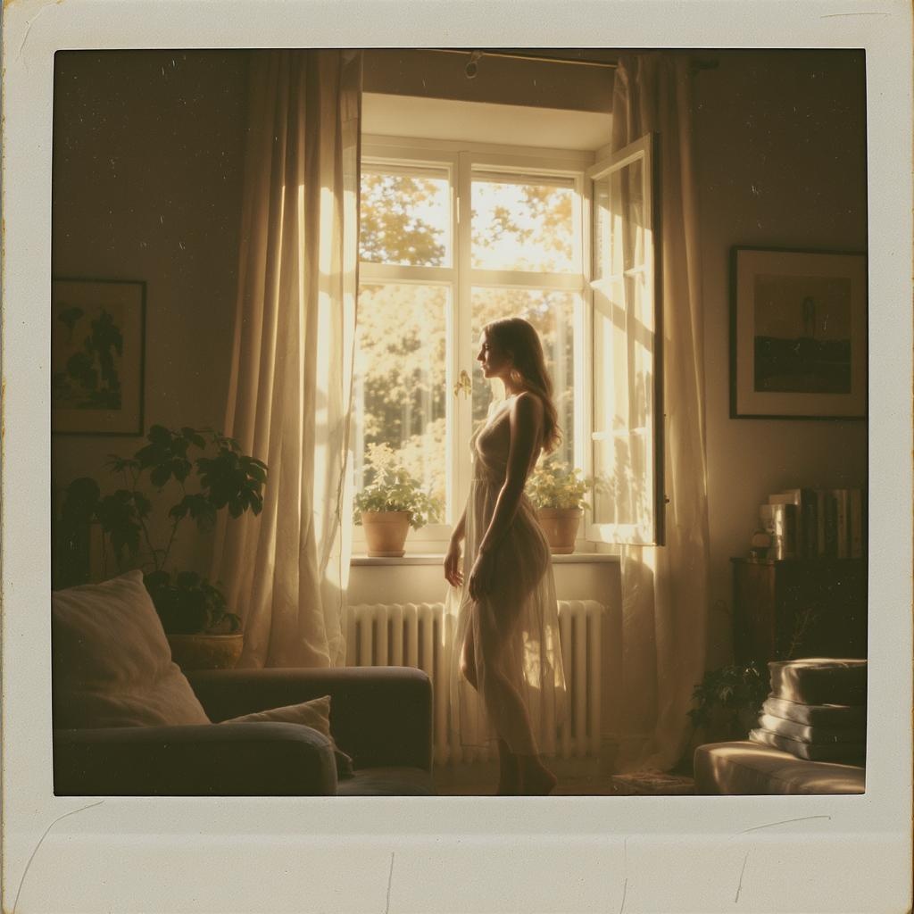 In a tranquil, beautifully intimate scene, a woman stands gracefully in a cozy, warmly-lit living space, wearing a flowing dress that subtly reveals her silhouette in the gentle sunlight filtering through an open window. The sunlight casts soft, golden hues and intricate shadows throughout the room, intensifying the serene and welcoming ambiance. Her posture is relaxed and natural, exuding an air of quiet thoughtfulness and elegance. The living space, adorned with personal touches, features artfully arranged books, lush greenery from potted plants, and selectively displayed artwork that infuses the area with warmth and personality. The muted color scheme enhances the scene's nostalgic allure, tinged by the Polaroid's vintage charm, as it captures the timeless, slightly retro aesthetic. The composition skillfully merges the cozy atmosphere with the woman's radiant simplicity, her form beautifully highlighted by the natural light, creating a moment that feels deeply personal, peaceful, and elegantly understated.