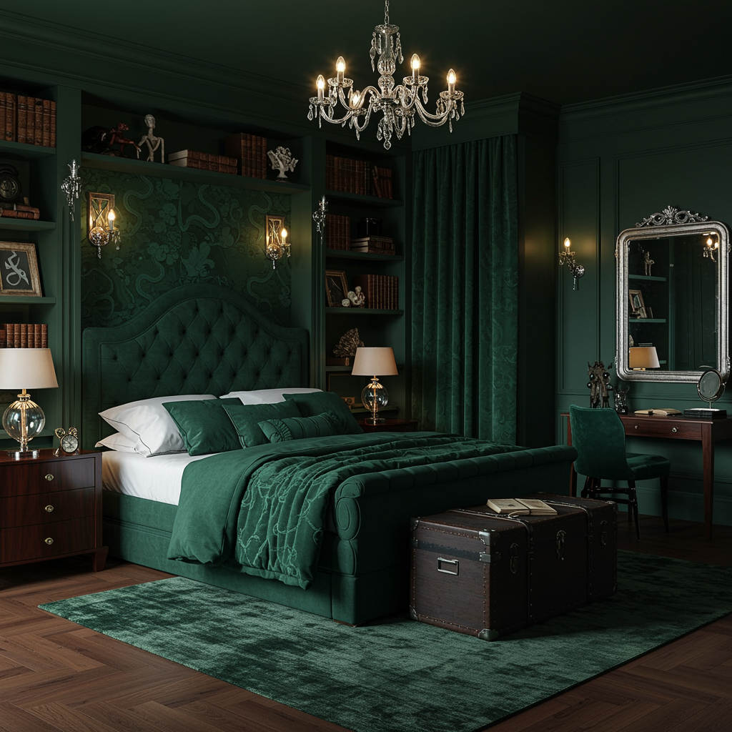 A sophisticated bedroom exudes an elegant and enigmatic Slytherin style, featuring deep, rich green walls complemented by dark mahogany wood accents. The room is dimly lit with vintage silver sconces, casting a subtle glow upon the velvet upholstered bed adorned with emerald and silver silken pillows. A plush, dark green rug covers the wooden floor, and intricately designed serpentine motifs subtly weave through the luxurious draperies. Shelves lined with leather-bound books and mysterious artifacts add an air of intellectual intrigue, while a sleek silver mirror reflects the room’s opulent charm. Vintage trunks serve as storage and decoration, and a cozy reading nook by the large window invites reflection and contemplation.