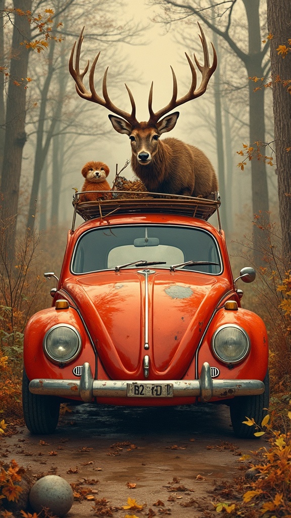 View this AI-generated image featuring vw beetle classic art piece blending rustic charm and gritty storytelling with kombuchapunk vibes surrounded by a tapestry of rusty remnants and hyper realistic illustrations of wildlife infused with rich hues of red and amber captured through a wide lens persp