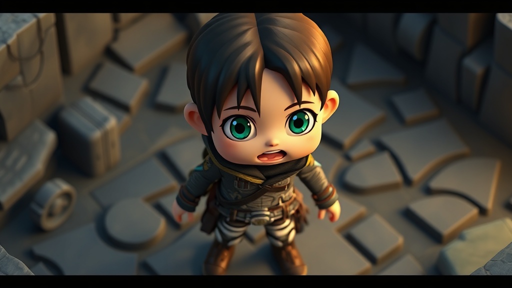 View this AI-generated image featuring bertolt hoover from attack on titan full body in an isometric 3d view transformed into a cute chibi character with an adorable disney pixar style perfect for a mobile game the scene features hyper realistic details with cinematic lighting while adding creative