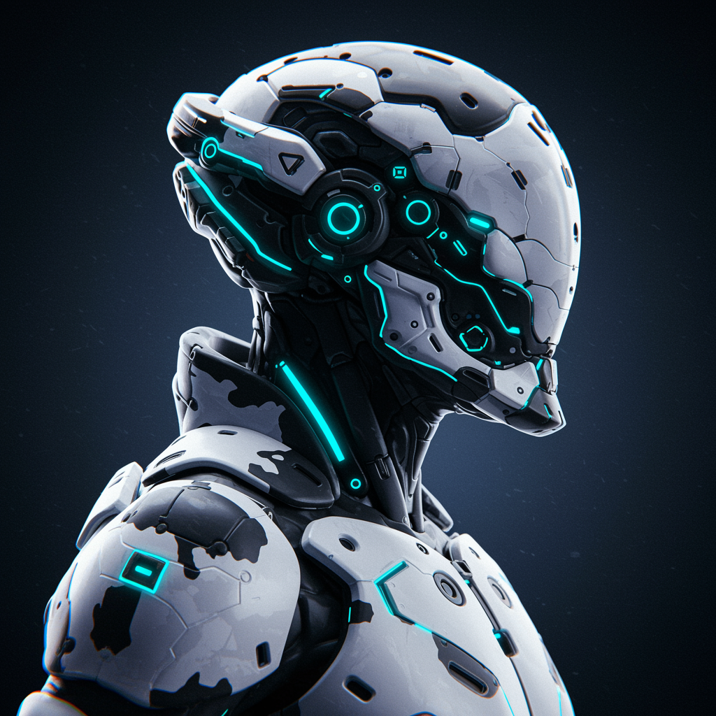 Best quality, masterpiece, high definition, extremely detailed, photorealistic futuristic military cyborg in a cyberpunk warframe, stealthily armored with neon lights, camouflage in white, black, and blue, epic character design with hard surfaces, smooth finishes, and a meticulously detailed face. Intricate details with a focus on symmetry and volumetric lighting enhanced by ambient light, creating a real-time VFX experience. Capturing a side profile with attention to unique features like the mouth, ears, and design elements. Distinctive and polished yet subtly asymmetrical, avoiding any elements that detract from the vision like deformities, poor anatomy, or awkward proportions. A focus on quality, avoiding distractions such as cropped or duplicated imagery, signatures, or unnecessary text or watermarks.