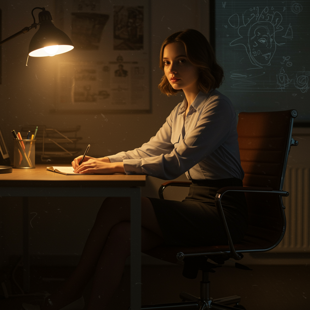 best quality, hyper detail, finely detailed, vibrant, delicate, 8k uhd, film texture, ultra high resolution, superior quality, photo, 4k, dim lighting, deep shadows, low key, Gini, a young woman, office setting, seated at a desk, professional attire, tailored pencil skirt, incorporating subtle elements of abstract art, nuanced sketches, artistic flair