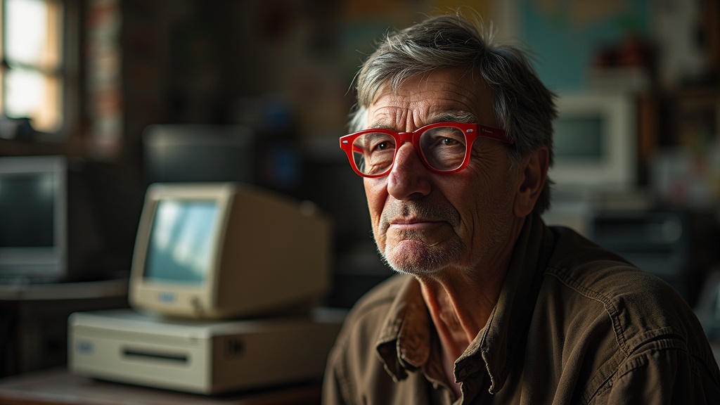 bill gates homeless indigent wearing red glasses held together with tape, dressed in old, torn, and dirty clothes, illuminated by sunlight, sitting next to a pile of obsolete computers and printers, captured with a Canon EOS Rebel SL2, EF100mm, f/2.8L, Macro IS USM, at f/2.8, 100mm, 1/1000s, ISO 100, scene depicts stark contrast between former tech empire and current state, emphasizing resilience and introspection.
