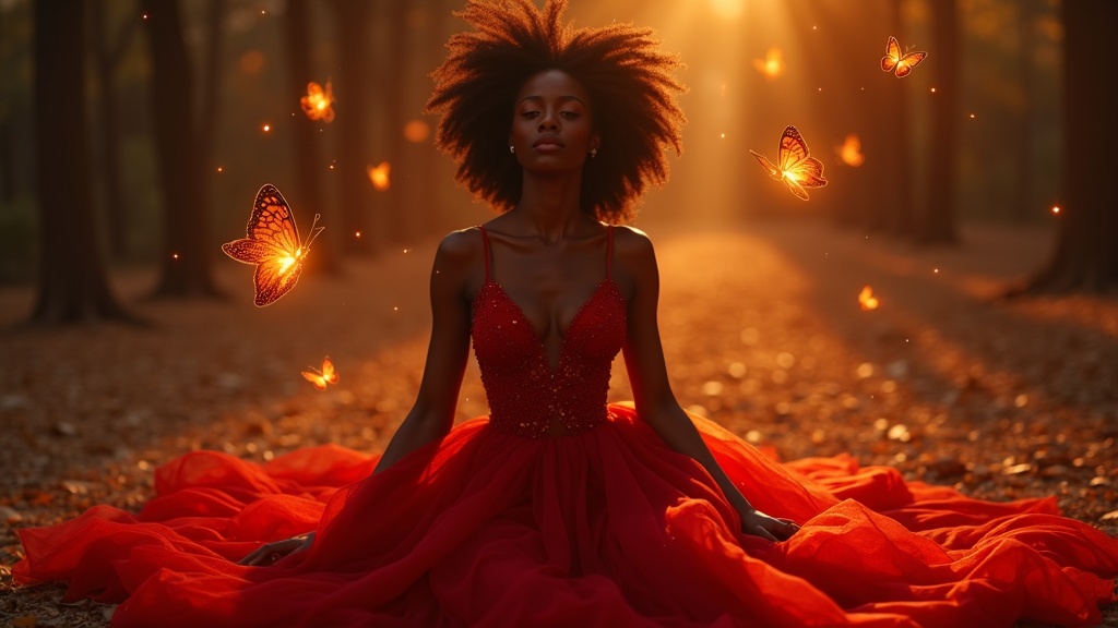 A radiant black African princess, her dark skin glowing with a celestial aura, sits gracefully on the ground in a stunning red dress. She embodies the divine essence of love, her presence transcending mere beauty. Delicate butterflies, seemingly made of shimmering firelight, dance around her, accentuating her regal poise. Her eyes reflect an ancient wisdom as they gaze into the cosmos, connecting her to realms beyond. With inspiration drawn from Thomas Blackshear and Lily Delissa Joseph, her visage evokes a mesmerizing blend of afrofuturism and black art, channeling the spiritual intensity of the butterfly goddess. Her aura melds the past and future into a timeless narrative, reminiscent of Eddie Mendoza and the surrealist touch of Rob Rey, painting her as the quintessential image of an African queen in a world full of wonder and transformation.