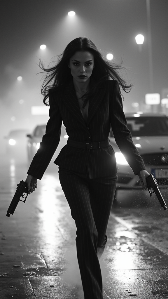 In a stark black and white film stock setting, high contrast highlights a full body movie clip of an intense gunfight action scene. A beautiful face of a noir 1940s detective woman nimbly dodges gunshots. Glass shatters dramatically around her as she moves with agility. Her long, shiny hair cascades down her back, with a few freckles visible on her skin. Dark, reflective eyes are accentuated by meticulous makeup. The skinny figure navigates through mist and fog, skimming over wet pavement. Dust particles catch the detailed lighting, with rim lighting casting a dramatic silhouette. Pinstripe trousers mingle with the ambiance provided by street lights, enriching the classic black and white photography. Shallow focus adds depth to the tweed textures and modern cars in the background. Despite elements like a keyboard and mouse subtly visible, the scene maintains its vintage allure. The visual narrative remains free from distractions, ensuring the detective's deft maneuvers in her era-appropriate attire are the focal point, against the atmospheric backdrop of noir intrigue and tension.