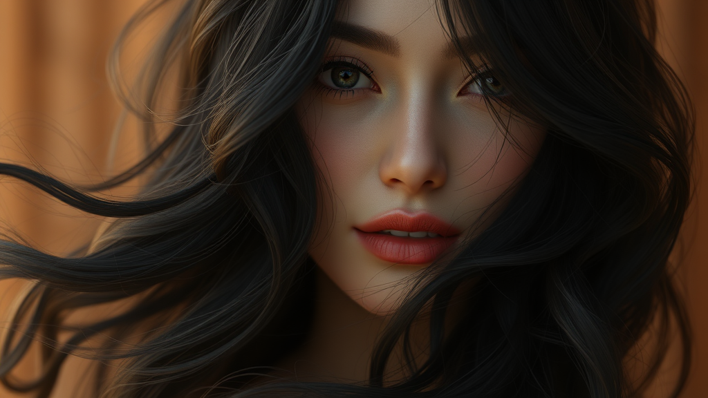 View this AI-generated image featuring a model with wavy black hair in the style of daz3d close up soft flowing warm brown tones circular composition akin to tondo cinematic ferrania p30 look smooth complexion ethereal atmosphere dreamlike chaos at 55 aspect ratio 1 2 personalized touch of yruxpc2 h
