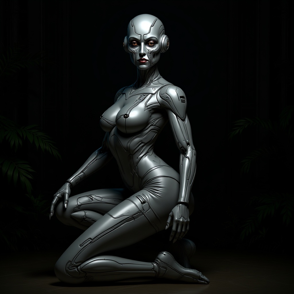 A full body portrait from head to toe, showcasing an exquisitely detailed porcelain-profile android with a blend of human and robotic features. The scene is set in a luxurious, soft studio light with rim lighting that highlights the vibrant details. This figure embodies cyberpunk aesthetics, adorned in latex, rubber, and lace, revealing hyperrealistic anatomical details, facial muscles intertwined with cables, electric wires, and microchips. The background is elegant, possibly a jungle or rainforest setting, reflecting a fusion of nature and technology. Rendered with the precision of 8k octane, this H. R. Giger-inspired masterpiece captures the theme of consciousness being downloaded into robotic forms. The android, with a silver helmet, kneels gracefully, embodying a future vision. The art is a masterpiece in its detailing, meant as an ultra-high-resolution CG unity wallpaper that captivates with its absurd resolution and intricate artistry without falling into the pitfalls of poor anatomy or unrealistic features.