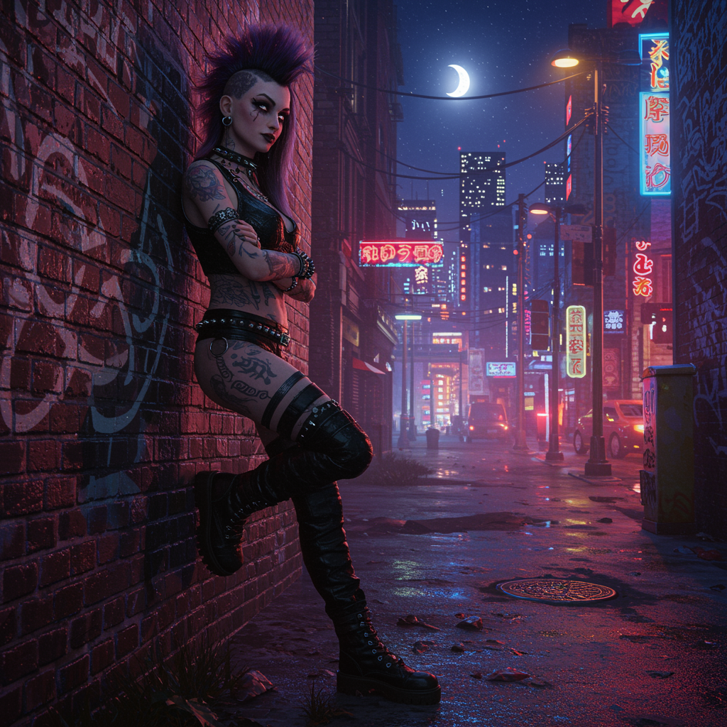 View this AI-generated image featuring a full body portrait of a cyberpunk woman leaning against a brick wall adorned with graffiti set in a vibrant cyberpunk city street at night the scene is illuminated by the glowing city lights with stars and a prominent moon in the sky she has a detailed symmet
