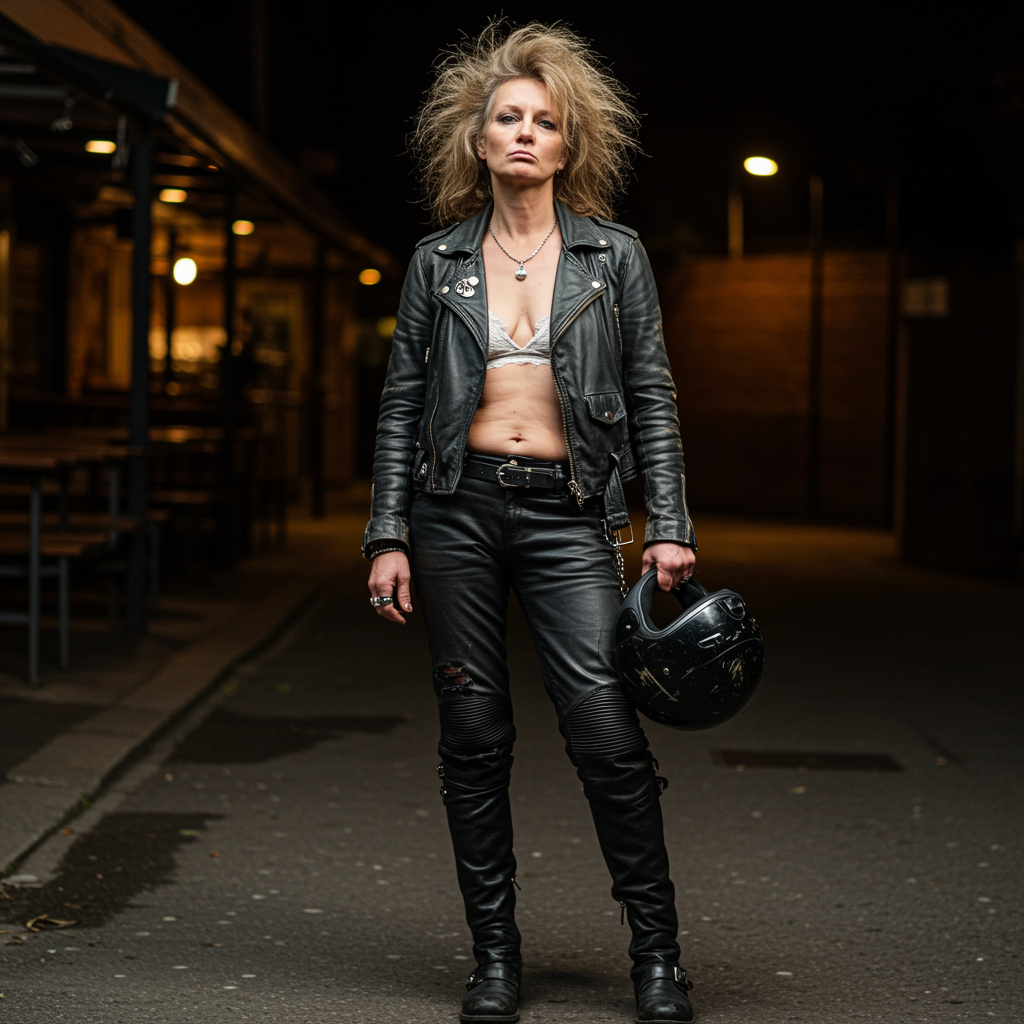 A middle-aged British woman with a punk, rebellious vibe stands in a dimly lit restaurant parking lot. Her hair is a wild tangle, embodying her carefree demeanor and bored expression. She wears a worn-out leather jacket and trousers, paired with sturdy boots that have seen many adventures. A hint of a white lace bra peeks through, adding an unexpected touch of contrast to her rugged look. In one hand, she casually holds a scuffed black helmet, hinting at a penchant for motorcycles. The setting, dimly illuminated, enhances the aura of gritty defiance that surrounds her.