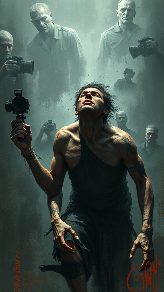 Broken but ready to fight, set against a gloomy background with an epic composition, the scene is brutal, cinematic, and dramatic. It's a digital painting inspired by expressionism, capturing an emotionally profound and unforgettable moment in high quality. Despite the focus on the central figure, elements of distortion permeate: jpeg artifacts, blurred lines, and hints of mutation affect the surroundings. Strangely, there are deformed and malformed limbs, with odd proportions and extra limbs appearing in the haze. The atmosphere is morbid and disfigured, with a somber quality that adds to the scene's tension. Everything feels slightly off, from the poorly drawn hands and face to the strangely elongated neck. There's a sense of clutter as if faces have been cloned and limbs misplaced. In the background, vague impressions of cameras, names, and signatures blend into the chaos, contributing to the overall sense of disarray.